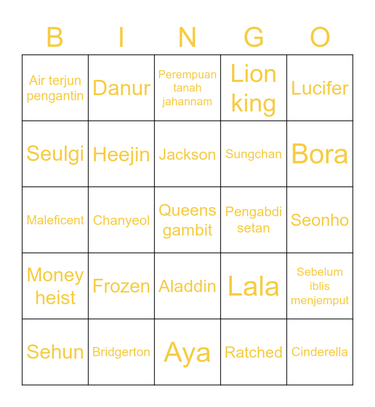This bingo card has 25 words: Money heist, Bridgerton, Queens gambit, Ratched, Lucifer, Air terjun pengantin, Danur, Perempuan tanah jahannam, Pengabdi setan, Sebelum iblis menjemput, Seulgi, Heejin, Aya, Lala, Bora, Sehun, Chanyeol, Jackson, Sungchan, Seonho, Maleficent, Frozen, Aladdin, Lion king and Cinderella.