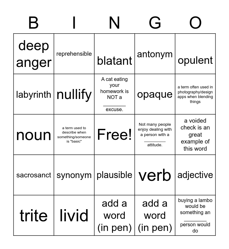 This bingo card has a free space and 24 words: synonym, livid, A cat eating your homework is NOT a ________ excuse., trite, opulent, deep anger, labyrinth, reprehensible, Not many people enjoy dealing with a person with a _________ attitude., plausible, opaque, noun, verb, adjective, nullify, add a word (in pen), a voided check is an great example of this word, blatant, a term often used in photography/design apps when blending things, a term used to describe when something/someone is "basic", buying a lambo would be something an ________ person would do, sacrosanct, antonym and add a word (in pen).