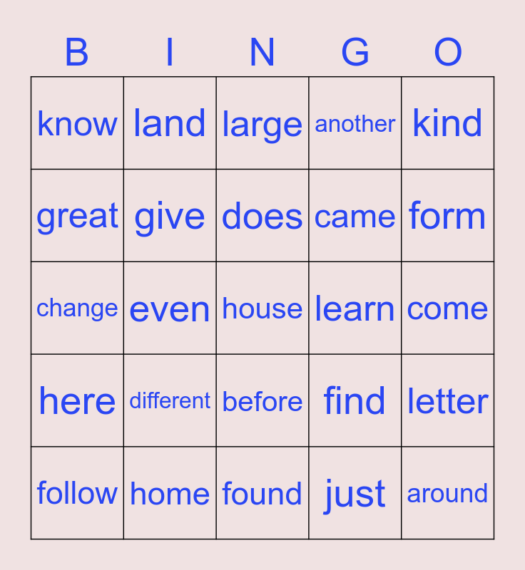 This bingo card has 25 words: here, home, house, just, kind, know, land, large, learn, letter, great, give, found, find, form, follow, even, does, came, come, change, different, before, another and around.