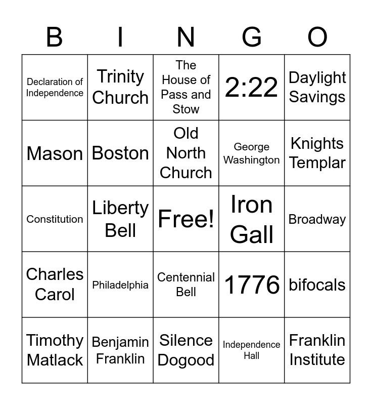 This bingo card has a free space and 24 words: Philadelphia, Benjamin Franklin, Old North Church, Timothy Matlack, Daylight Savings, Declaration of Independence, Mason, Trinity Church, Iron Gall, Centennial Bell, George Washington, Constitution, 1776, bifocals, Boston, Independence Hall, Broadway, The House of Pass and Stow, Knights Templar, Liberty Bell, Franklin Institute, Charles Carol, 2:22 and Silence Dogood.
