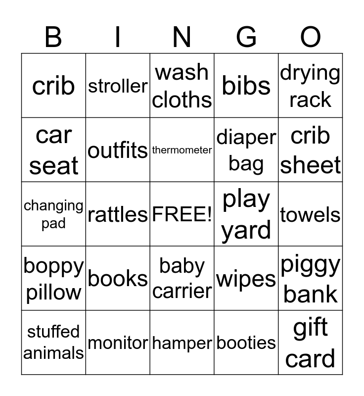 This bingo card has a free space and 24 words: books, monitor, thermometer, stuffed animals, drying rack, crib, car seat, stroller, play yard, baby carrier, diaper bag, changing pad, wipes, piggy bank, outfits, booties, towels, wash cloths, crib sheet, rattles, gift card, boppy pillow, bibs and hamper.