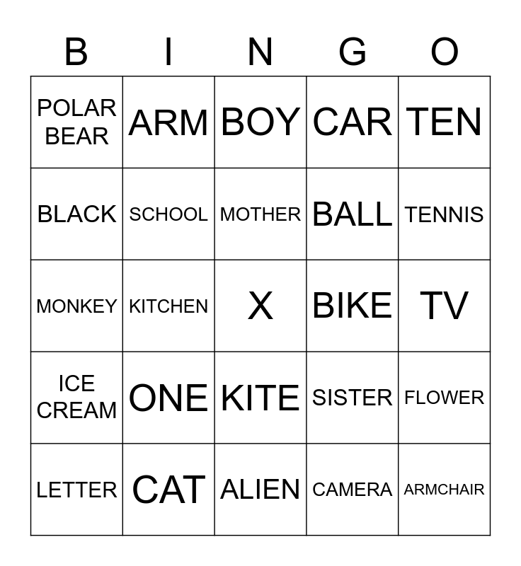 This bingo card has a free space and 24 words: ONE, CAT, MOTHER, LETTER, TEN, POLAR BEAR, BLACK, ARM, BIKE, KITE, BALL, MONKEY, SISTER, FLOWER, SCHOOL, CAMERA, TV, BOY, TENNIS, KITCHEN, ARMCHAIR, ICE CREAM, CAR and ALIEN.