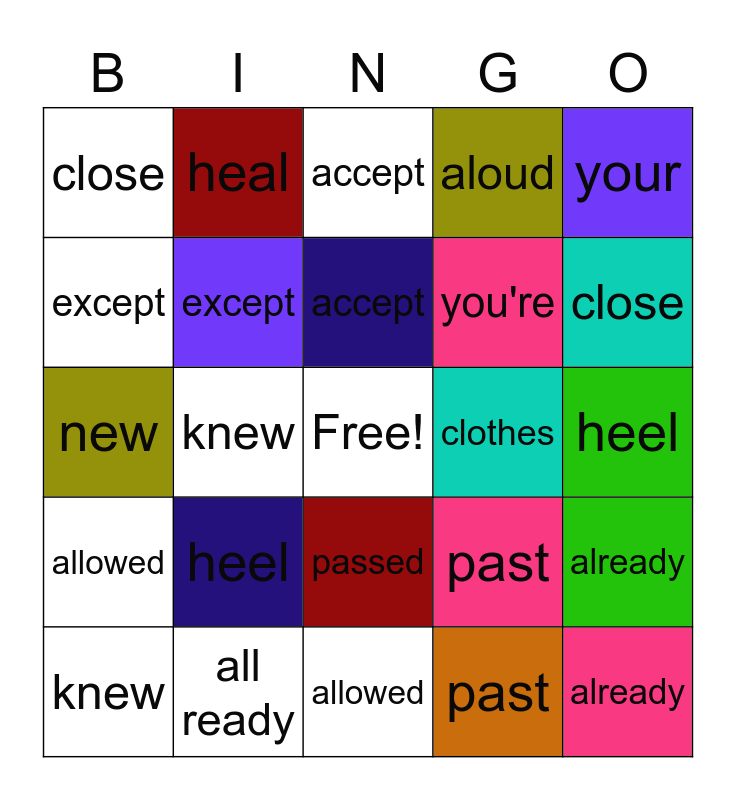 This bingo card has a free space and 24 words: heel, all ready, accept, knew, your, close, except, heal, clothes, passed, you're, new, past, already, except, past, heel, accept, close, knew, already, allowed, aloud and allowed.