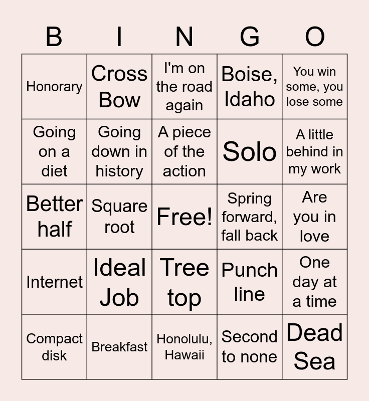 This bingo card has a free space and 34 words: Big Brother, Little Sister, Second to none, I belong to you, I am counting on you, Internet, Going down in history, You win some, you lose some, Compact disk, Cross Bow, The calm before the storm, A piece of the action, I'm on the road again, Going over the speed limit, Back to you, Spring forward, fall back, A little behind in my work, Breakfast, Better half, Ideal Job, Punch line, Tree top, Inexpensive, Honorary, Are you in love, Honolulu, Hawaii, Dead Sea, Boise, Idaho, Life Insurance, Solo, Going on a diet, Calm Down, Square root, One day at a time and Middle School.