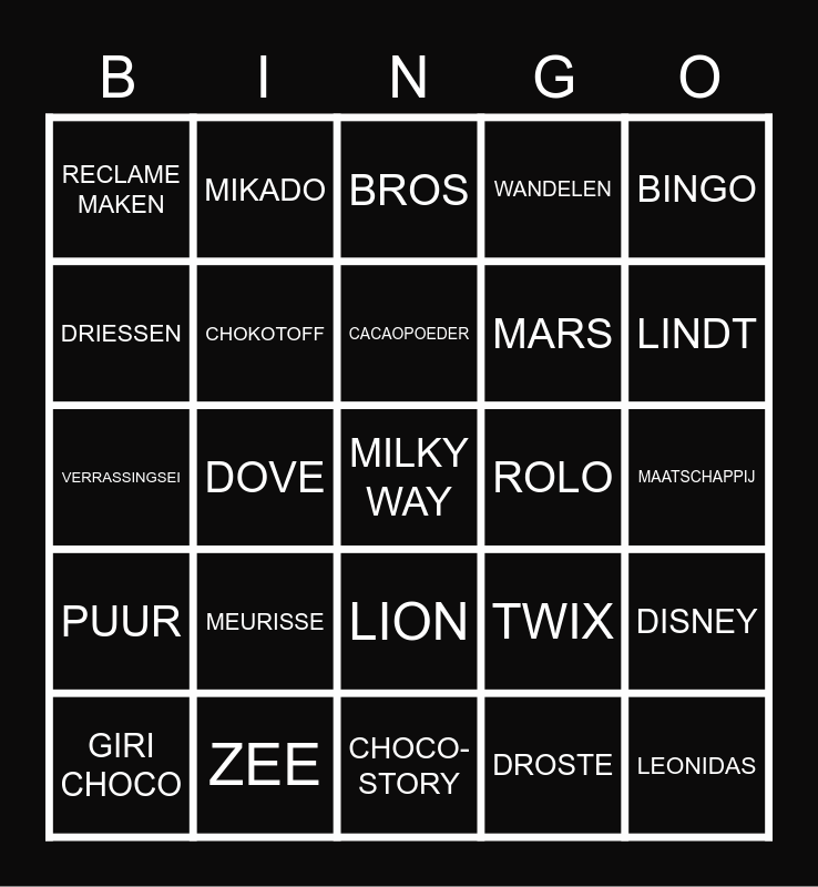 This bingo card has 70 words: Free!, MAATSCHAPPIJ, SCHEVENINGEN, KEIZERSTRAAT, ZEE, STRAND, WANDELEN, VAKANTIE, BINGO, FRENK & CORA, DISNEY, WINNEN, RECLAME MAKEN, BROS, DAIM, DOVE, LION, MARS, NUTS, PUUR, ROLO, TWIX, LINDT, MERCI, MILKA, BOUNTY, CHA-CHA, DELREY, DROSTE, KITKAT, MIKADO, PAASEI, VANOVA, BROWNIE, GUYLIAN, NEUHAUS, PRALINE, TJOKLAT, CANDYBAR, DRIESSEN, LEONIDAS, MEURISSE, MILKY WAY, SNICKERS, VICTORIA, CHOKOTOFF, GIRI CHOCO, HAGELSLAG, MALTESERS, MARTOUGIN, NEGERZOEN, TOBLERONE, VAN HOUTEN, ZEEBANKET, CHOCO-STORY, MONTSERRAT, CACAOPOEDER, DOMINOSTEIN, MOZARTKUGEL, CHOCOLADEMUNT, VERRASSINGSEI, CHOCOLADETAART, CHOCOLADEFONDUE, CHOCOLADELETTER, CHOCOLADEMOUSSE, CHOCOLADESIROOP, ANTWERPSE HANDJES, CHOCOLADEFONTEIN, CHOCOLADESIGARET and CHOCOLADEVLOKKEN.
