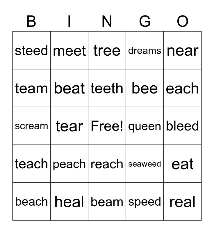 This bingo card has a free space and 24 words: peach, heal, teeth, beach, near, steed, team, meet, queen, reach, bee, scream, seaweed, eat, beat, speed, bleed, tree, each, tear, real, teach, dreams and beam.