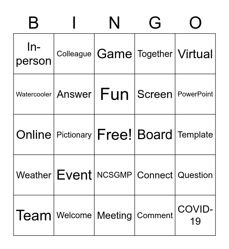 This bingo card has a free space and 24 words: Event, Welcome, Fun, Team, Virtual, In-person, Watercooler, Colleague, Board, NCSGMP, Screen, Online, Connect, Question, Answer, Comment, Template, Game, PowerPoint, Pictionary, COVID-19, Weather, Together and Meeting.