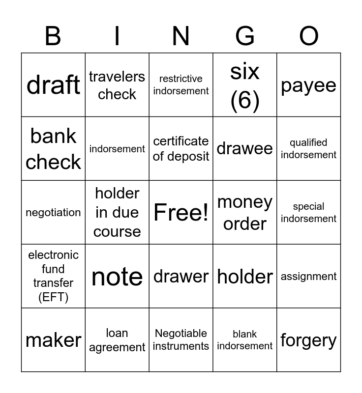 This bingo card has a free space and 24 words: note, loan agreement, certificate of deposit, maker, payee, draft, bank check, travelers check, money order, drawer, drawee, negotiation, holder, assignment, indorsement, blank indorsement, special indorsement, restrictive indorsement, qualified indorsement, holder in due course, forgery, electronic fund transfer (EFT), six (6) and Negotiable instruments.
