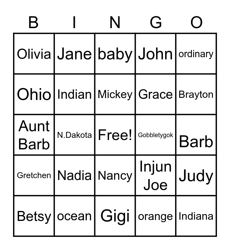 This bingo card has a free space and 29 words: Betsy, Inge, N.Dakota, George, Olivia, baby, Indian, Nadia, Gobbletygok, ocean, Barb, Indiana, Gigi, orange, Brayton, Ignoramus, Nancy, Gretchen, ordinary, Aunt Barb, Injun Joe, Nelda, Grace, Ohio, John, Jane, Judy, Mickey and Max.