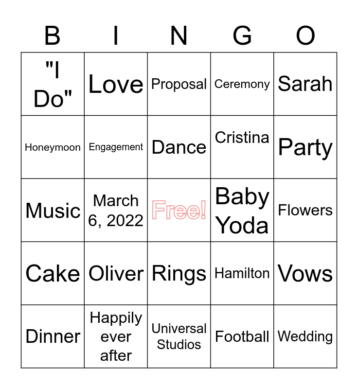 This bingo card has a free space and 24 words: Oliver, Happily ever after, Dance, Dinner, Sarah, "I Do", Honeymoon, Love, Baby Yoda, Rings, Cristina, Music, Hamilton, Vows, Engagement, Football, Flowers, Proposal, Party, March 6, 2022, Wedding, Cake, Ceremony and Universal Studios.