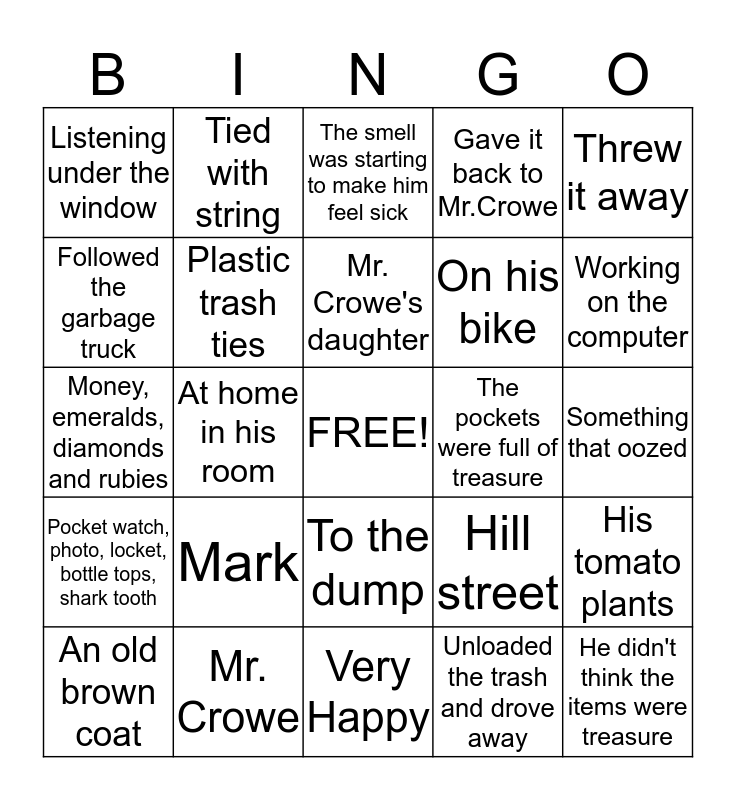 This bingo card has a free space and 24 words: Mark, Mr. Crowe, Mr. Crowe's daughter, An old brown coat, Threw it away, Listening under the window, Followed the garbage truck, Tied with string, The pockets were full of treasure, To the dump, On his bike, Money, emeralds, diamonds and rubies, Hill street, His tomato plants, Plastic trash ties, Unloaded the trash and drove away, Something that oozed, The smell was starting to make him feel sick, Working on the computer, At home in his room, He didn't think the items were treasure, Pocket watch, photo, locket, bottle tops, shark tooth, Gave it back to Mr.Crowe and Very Happy.