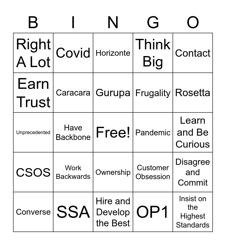 This bingo card has a free space and 34 words: OP1 Aviary CSC CSOS Caracara Contact Converse Covid Deprecation Gurupa Horizonte LISA ML Pandemic Rosetta SSA Unprecedented Work Backwards Customer Obsession Ownership Invent and Simplify Right A Lot Learn and Be Curious Hire and De, OP1, Aviary, CSC, CSOS, Caracara, Contact, Converse, Covid, Deprecation, Gurupa, Horizonte, LISA, ML, Pandemic, Rosetta, SSA, Unprecedented, Work Backwards, Customer Obsession, Ownership, Invent and Simplify, Right A Lot, Learn and Be Curious, Hire and Develop the Best, Insist on the Highest Standards, Think Big, Bias for Action, Frugality, Earn Trust, Dive Deep, Have Backbone, Disagree and Commit and Deliver Results.