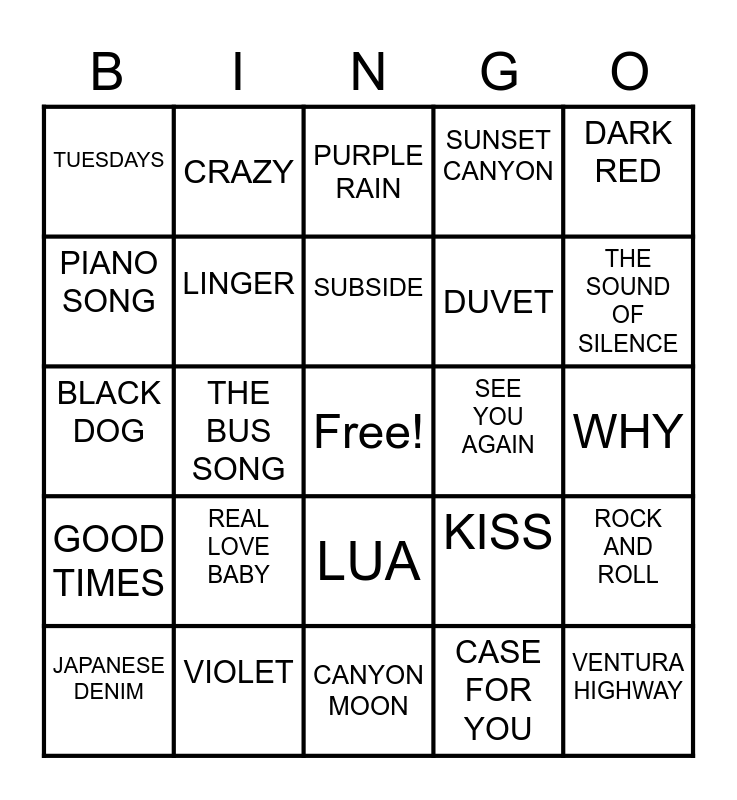This bingo card has a free space and 24 words: REAL LOVE BABY, VIOLET, SUBSIDE, JAPANESE DENIM, DARK RED, TUESDAYS, PIANO SONG, CRAZY, SEE YOU AGAIN, LUA, DUVET, BLACK DOG, KISS, ROCK AND ROLL, LINGER, CASE FOR YOU, WHY, PURPLE RAIN, THE SOUND OF SILENCE, THE BUS SONG, VENTURA HIGHWAY, GOOD TIMES, SUNSET CANYON and CANYON MOON.