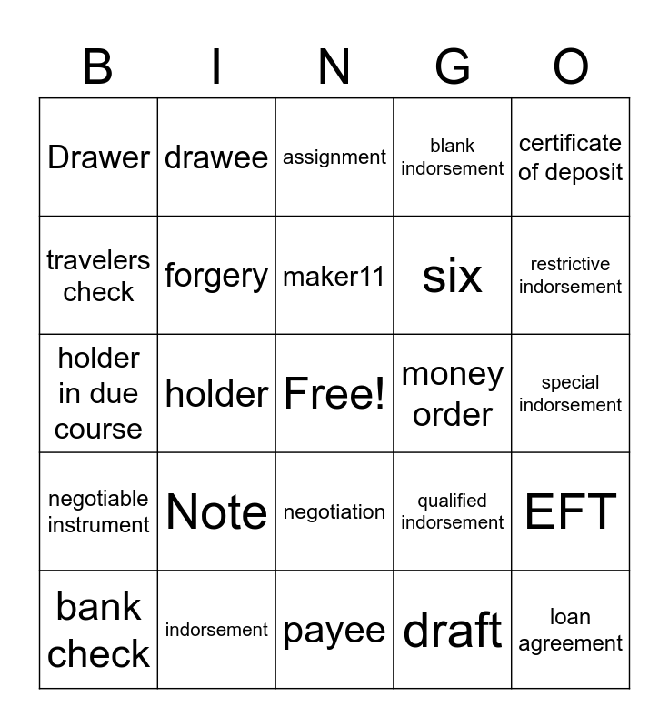 This bingo card has a free space and 24 words: Note, indorsement, maker11, bank check, certificate of deposit, Drawer, travelers check, drawee, money order, negotiation, six, holder in due course, qualified indorsement, EFT, forgery, draft, special indorsement, assignment, restrictive indorsement, holder, loan agreement, negotiable instrument, blank indorsement and payee.