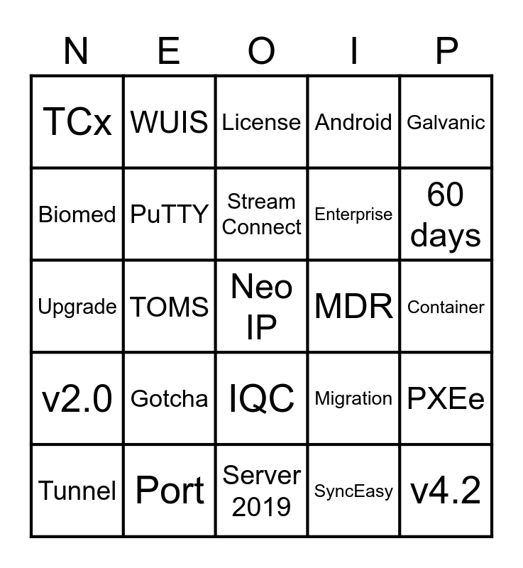 This bingo card has a free space and 24 words: Gotcha, Port, Stream Connect, Tunnel, Galvanic, TCx, Biomed, WUIS, MDR, IQC, Enterprise, Upgrade, Migration, PXEe, PuTTY, SyncEasy, Container, License, 60 days, TOMS, v4.2, v2.0, Android and Server 2019.