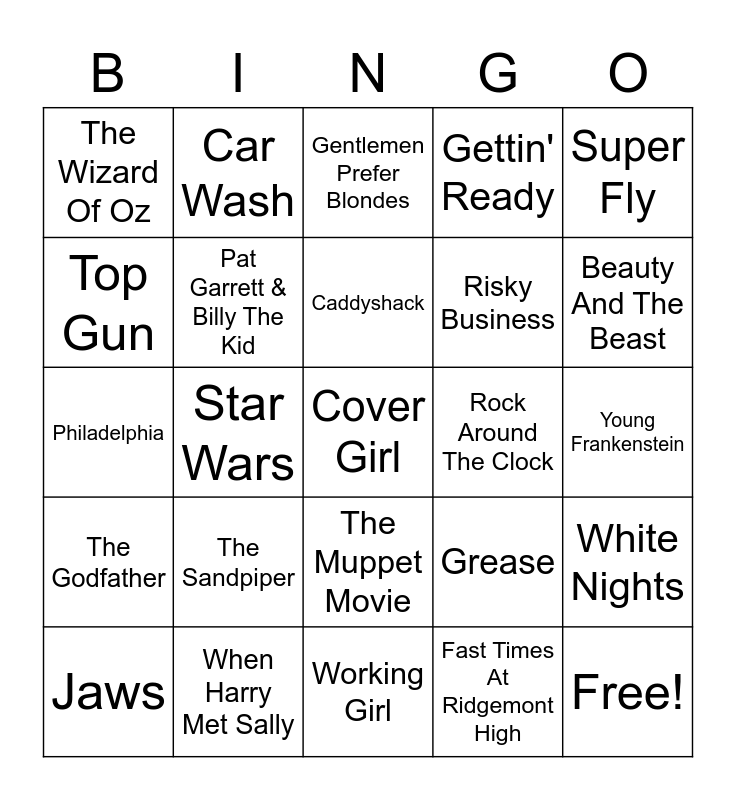This bingo card has 33 words: Free!, Reservoir Dogs, Star Wars, Harry Potter, The Godfather, Pat Garrett & Billy The Kid, Super Fly, Jaws, Car Wash, Rocky III, Caddyshack, Gentlemen Prefer Blondes, Easy Rider, Shaft, Rock Around The Clock, Beauty And The Beast, When Harry Met Sally, Philadelphia, The Sandpiper, Grease, The Muppet Movie, Moulin Rouge, The Wizard Of Oz, Young Frankenstein, Working Girl, Cover Girl, Gettin' Ready, Risky Business, Top Gun, White Nights, An Officer And A Gentleman, Fast Times At Ridgemont High and Chicago.