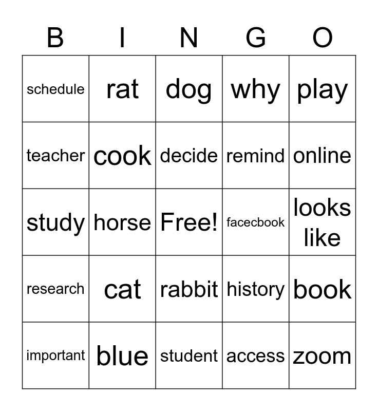 This bingo card has a free space and 24 words: cat, blue, decide, important, play, schedule, teacher, rat, facecbook, rabbit, remind, study, history, book, cook, access, looks like, dog, online, horse, zoom, research, why and student.