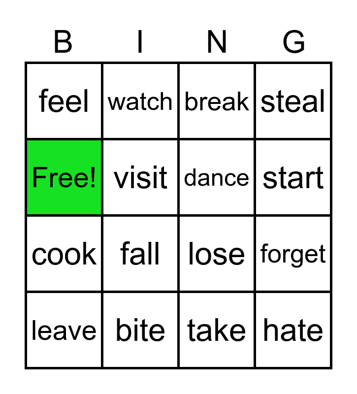 This bingo card has 16 words: bite, forget, break, feel, cook, watch, lose, take, Free!, visit, leave, steal, fall, start, dance and hate.