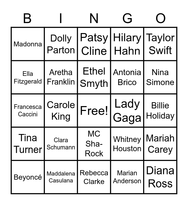 This bingo card has a free space and 24 words: Clara Schumann, Maddalena Casulana, Ethel Smyth, Beyoncé, Taylor Swift, Madonna, Ella Fitzgerald, Dolly Parton, Lady Gaga, MC Sha-Rock, Antonia Brico, Francesca Caccini, Whitney Houston, Mariah Carey, Aretha Franklin, Marian Anderson, Billie Holiday, Patsy Cline, Nina Simone, Carole King, Diana Ross, Tina Turner, Hilary Hahn and Rebecca Clarke.