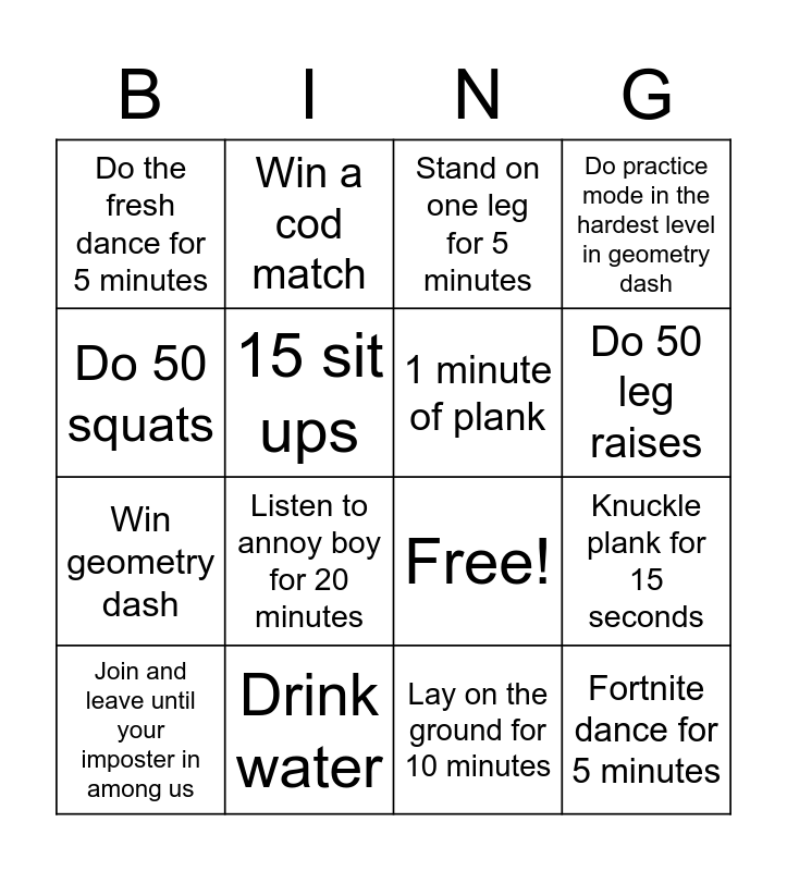 This bingo card has 22 words: Drink water, Win an among us match, Win a cod match, Dance to baby shark, 15 sit ups, 1 minute of plank, Do the fresh dance for 5 minutes, Stand on one leg for 5 minutes, Free!, Fortnite dance for 5 minutes, Win geometry dash, Do practice mode in the hardest level in geometry dash, Count to 500, 250 jumping jacks, Lay on the ground for 10 minutes, army crawl for 7 minutes, Knuckle plank for 15 seconds, Join and leave until your imposter in among us, Listen to annoy boy for 20 minutes, Do 50 squats, Do 50 leg raises and Say your name 100 times.