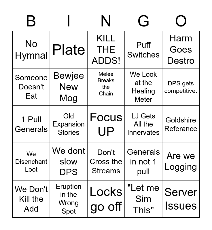 This bingo card has a free space and 24 words: We dont slow DPS, Eruption in the Wrong Spot, Melee Breaks the Chain, We Don't Kill the Add, Harm Goes Destro, No Hymnal, Someone Doesn't Eat, Plate, LJ Gets All the Innervates, Don't Cross the Streams, We Look at the Healing Meter, 1 Pull Generals, Generals in not 1 pull, Are we Logging, Bewjee New Mog, "Let me Sim This", Goldshire Referance, KILL THE ADDS!, DPS gets competitive., Old Expansion Stories, Server Issues, We Disenchant Loot, Puff Switches and Locks go off.