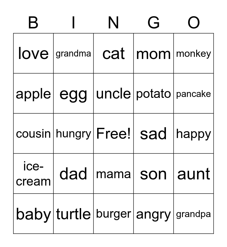 This bingo card has a free space and 29 words: baby, sister, hungry, cookie, love, cat, egg, dad, sad, turtle, happy, grandpa, burger, angry, pancake, excited, mama, ice-cream, monkey, cousin, son, daughter, potato, apple, mom, grandma, aunt, uncle and narwhal.