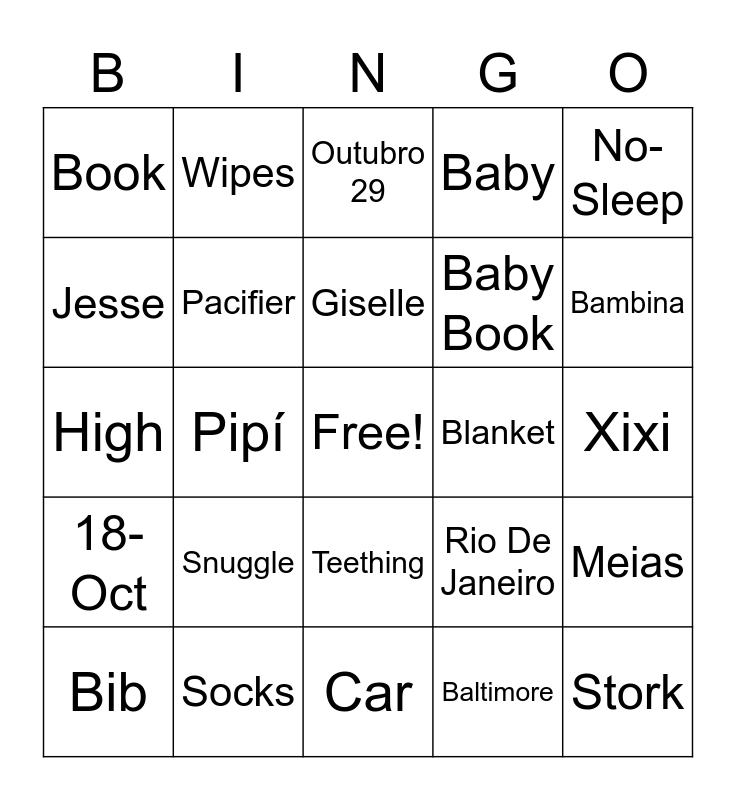 This bingo card has a free space and 45 words: Pee, Stork, Bath, Bib, San Diego, Baltimore, Outubro 29, Rattle, No-Sleep, Socks, Baby, Blanket, Teething, Snuggle, Bassinet, Car, Baby Monitor, High, Lullaby, Bambina, Wipes, Papa, Seat, Book, Chair, Xixi, Tub, Babador, Rio De Janeiro, 18-Oct, Chocalho, Meias, Monitor, Ring, Sem-Dormir, Pipí, Cegonha, Fairfax, Banheira, Giselle, Jesse, Baby Book, Daughter, Pacifier and Baby Stroller.