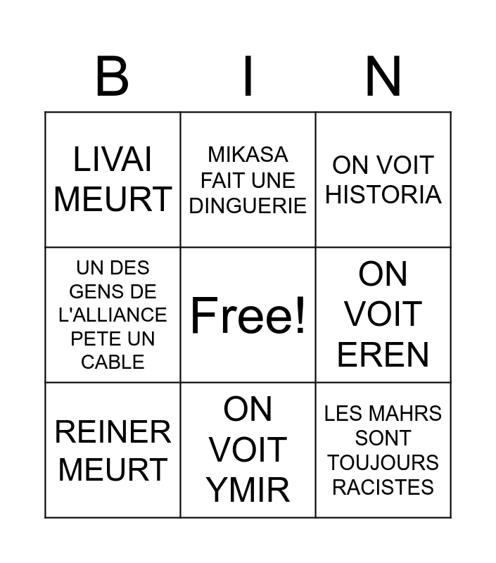 This bingo card has a free space and 8 words: ON VOIT EREN, ON VOIT HISTORIA, MIKASA FAIT UNE DINGUERIE, REINER MEURT, LIVAI MEURT, LES MAHRS SONT TOUJOURS RACISTES, UN DES GENS DE L'ALLIANCE PETE UN CABLE and ON VOIT YMIR.