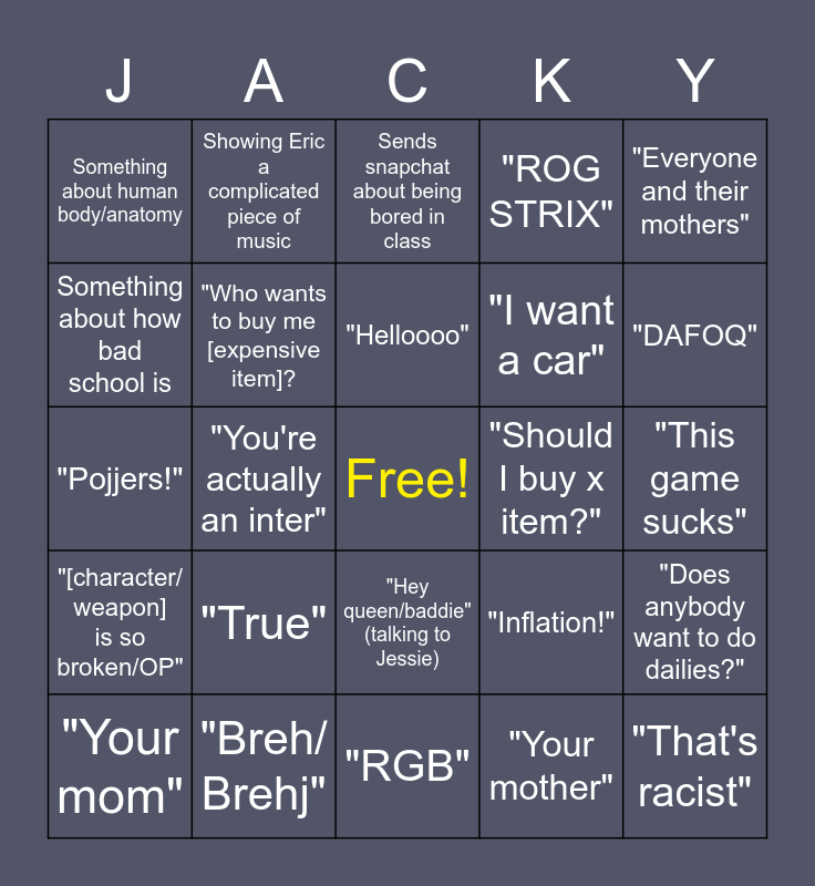 This bingo card has a free space and 24 words: "True", "Breh/ Brehj", "Helloooo", "Your mom", "Everyone and their mothers", Something about human body/anatomy, Something about how bad school is, Showing Eric a complicated piece of music, "Should I buy x item?", "Hey queen/baddie" (talking to Jessie), "I want a car", "Pojjers!", "Inflation!", "Does anybody want to do dailies?", "Who wants to buy me [expensive item]?, "Your mother", "This game sucks", Sends snapchat about being bored in class, "DAFOQ", "You're actually an inter", "That's racist", "[character/ weapon] is so broken/OP", "ROG STRIX" and "RGB".