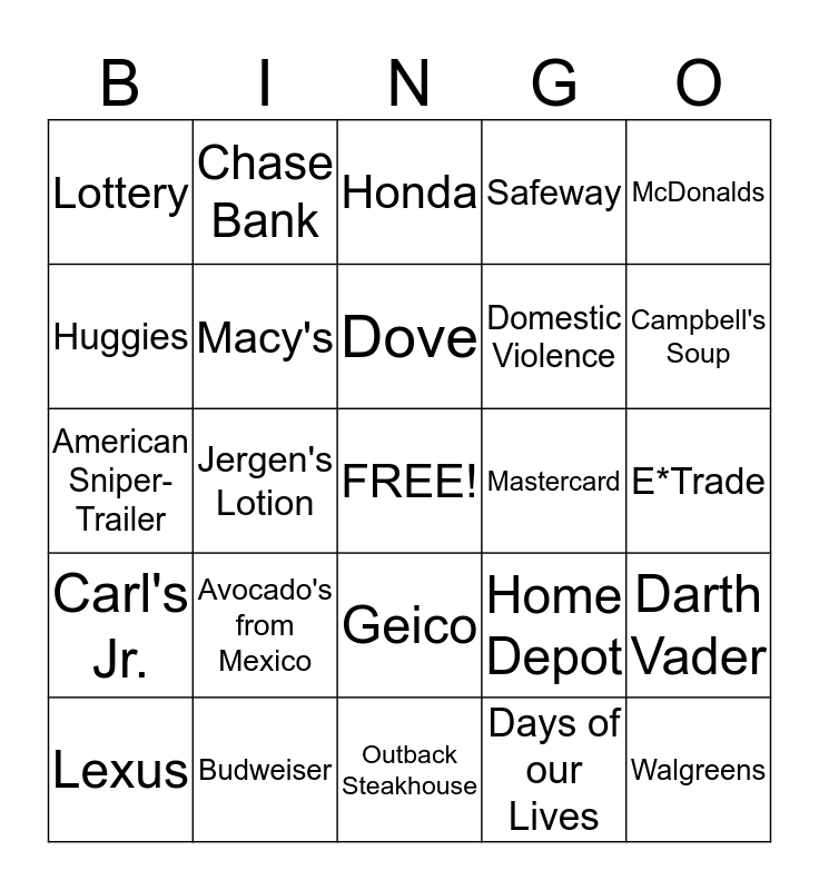 This bingo card has a free space and 24 words: Avocado's from Mexico, Budweiser, Dove, Lexus, McDonalds, Lottery, Huggies, Chase Bank, Mastercard, Geico, Domestic Violence, American Sniper-Trailer, Home Depot, Darth Vader, Macy's, Days of our Lives, E*Trade, Honda, Campbell's Soup, Jergen's Lotion, Walgreens, Carl's Jr., Safeway and Outback Steakhouse.