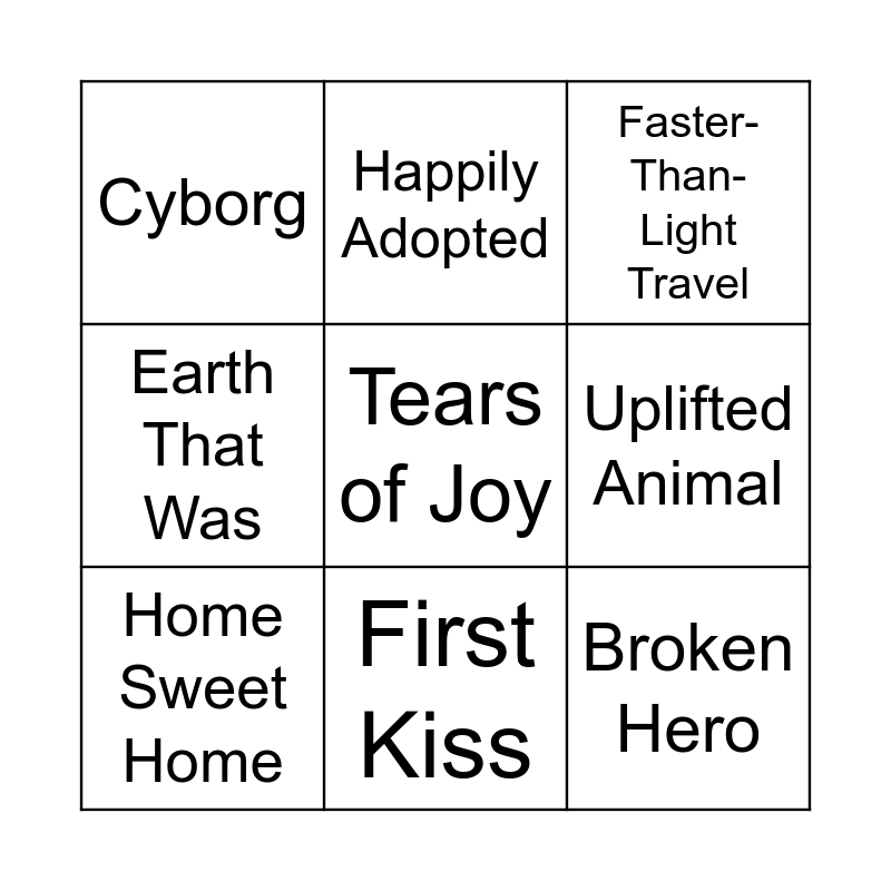 This bingo card has 90 words: Arranged Marriage, Green-Eyed Epiphany, Childhood Friend Romance, Rejected Marriage Proposal, Lovable Rogue, Fake Relationship, Star-Crossed Lovers, Battle Couple, Unresolved Sexual Tension, Bodyguard Crush, Meet Cute, In Love With Love, The Matchmaker, Rescue Romance, There Is Only One Bed, First Kiss, Love Confession, Romantic Rain, Undercover as Lovers, Secret Relationship, Cyberpunk, Synthetic Plague, Alien Invasion, Stable Time Loop, Steampunk, AI is a Crapshoot, Ancient Astronauts, Super Soldier, World War Whatever, Space Western, Terraform, Androids and Detectives, City Planet, Cloning Blues, Cyborg, Earth That Was, Faster-Than-Light Travel, Feudal Future, First Contact, Freak Lab Accident, Humanity's Wake, Uplifted Animal, The Multiverse, Space Pirates, Pardon My Klingon, Trauma Conga Line, Alone in a Crowd, Antagonist in Mourning, Appearance Angst, Eye Scream, Big "Why?!", Broken Hero, Cope by Pretending, Heal It With Booze, Despair Event Horizon, Self-Surgery, His Own Worst Enemy, Lonely at the Top, Losing the Team Spirit, My God, What Have I Done?, Rage Against the Reflection, Survivor's Guilt, Hanahaki Disease, Sadistic Choice, Buried Alive, Danger - Thin Ice, Mortal Wound Reveal, Rasputinian Death, Mind Control, Choke Holds, Babies Ever After, Cheery Pink, Comfort Food, Everybody Lives, Happily Adopted, Home Sweet Home, Happy Dance, Pet the Dog, Pursue the Dream Job, Happily Married, So Proud of You, Tears of Joy, You Are Not Alone, Family of Choice, Bear Hug, Friendship Trinket, Platonic Declaration of Love, Vitriolic Best Buds, The Power of Family and Hot Drink Cure.