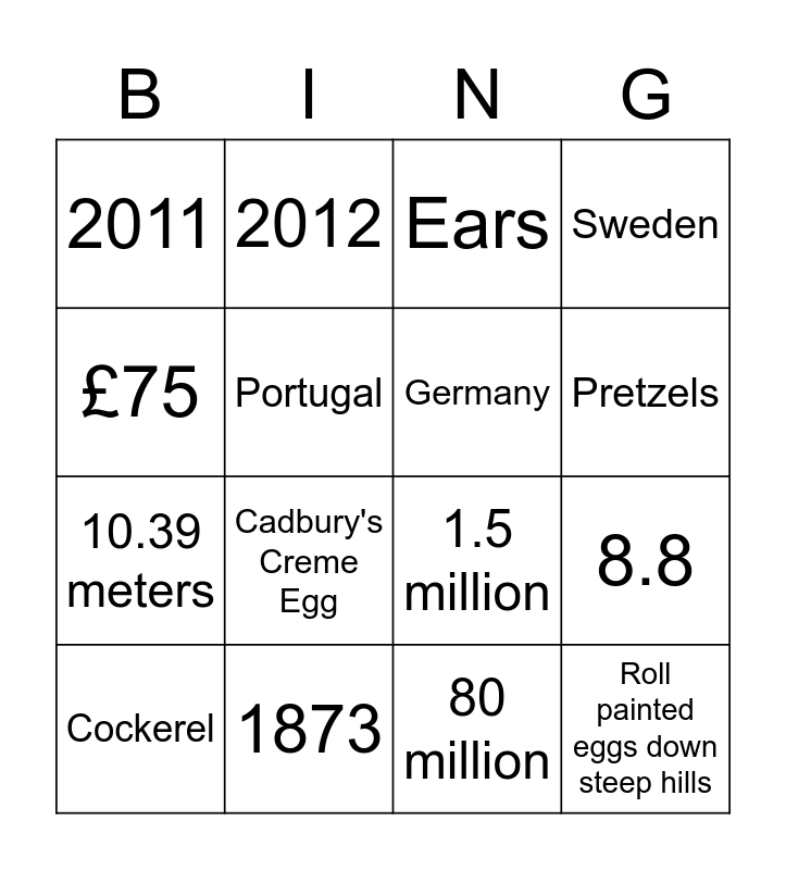 This bingo card has 20 words: 8.8, £9 million, Ears, Fry's of Bristol, Cockerel, £75, 1873, 2011, 10.39 meters, 2012, Cadbury's Creme Egg, 1.5 million, Portugal, Roll painted eggs down steep hills, Germany, Ukraine, Pretzels, Sweden, 80 million and Lent.