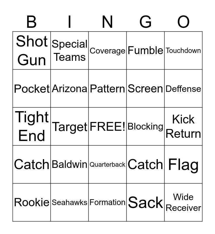 This bingo card has a free space and 24 words: Baldwin, Seahawks, Pattern, Rookie, Touchdown, Shot Gun, Pocket, Special Teams, Blocking, Quarterback, Screen, Tight End, Catch, Flag, Arizona, Sack, Kick Return, Coverage, Deffense, Target, Wide Receiver, Catch, Fumble and Formation.