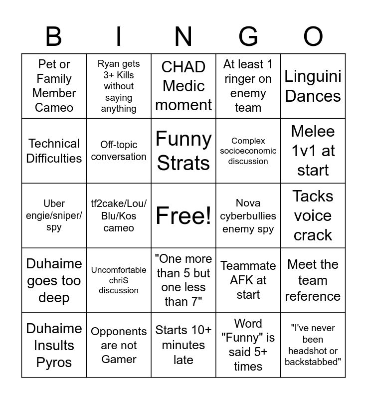 This bingo card has a free space and 24 words: Uncomfortable chriS discussion, Opponents are not Gamer, Funny Strats, Duhaime Insults Pyros, Linguini Dances, Pet or Family Member Cameo, Technical Difficulties, Ryan gets 3+ Kills without saying anything, Nova cyberbullies enemy spy, "One more than 5 but one less than 7", Complex socioeconomic discussion, Uber engie/sniper/ spy, Teammate AFK at start, Meet the team reference, Off-topic conversation, Word "Funny" is said 5+ times, Tacks voice crack, CHAD Medic moment, Melee 1v1 at start, tf2cake/Lou/ Blu/Kos cameo, "I've never been headshot or backstabbed", Duhaime goes too deep, At least 1 ringer on enemy team and Starts 10+ minutes late.