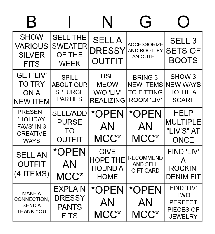 This bingo card has a free space and 24 words: *OPEN AN MCC*, EXPLAIN DRESSY PANTS FITS, USE 'MEOW' W/O 'LIV' REALIZING, MAKE A CONNECTION, SEND A THANK YOU, SELL 3 SETS OF BOOTS, SHOW VARIOUS SILVER FITS, GET 'LIV' TO TRY ON A NEW ITEM, SELL THE SWEATER OF THE WEEK, *OPEN AN MCC*, GIVE HOPE THE HOUND A HOME, BRING 3 NEW ITEMS TO FITTING ROOM 'LIV', PRESENT 'HOLIDAY FAVS' IN 3 CREATIVE WAYS, RECOMMEND AND SELL GIFT CARD, FIND 'LIV' A ROCKIN' DENIM FIT, SPILL ABOUT OUR SPLURGE PARTIES, *OPEN AN MCC*, HELP MULTIPLE "LIV'S" AT ONCE, SELL A DRESSY OUTFIT, SHOW 3 NEW WAYS TO TIE A SCARF, SELL/ADD PURSE TO OUTFIT, FIND 'LIV' TWO PERFECT PIECES OF JEWELRY, SELL AN OUTFIT (4 ITEMS), ACCESSORIZE AND BOOT-IFY AN OUTFIT and *OPEN AN MCC*.
