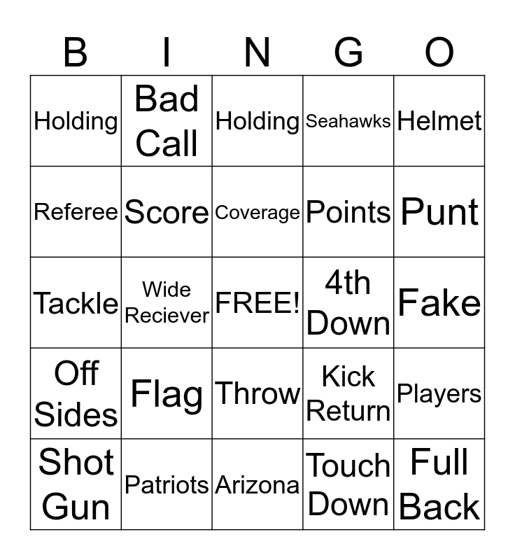 This bingo card has a free space and 24 words: Flag, Patriots, Coverage, Shot Gun, Helmet, Holding, Referee, Bad Call, 4th Down, Throw, Points, Tackle, Kick Return, Players, Score, Touch Down, Fake, Holding, Punt, Wide Reciever, Full Back, Off Sides, Seahawks and Arizona.