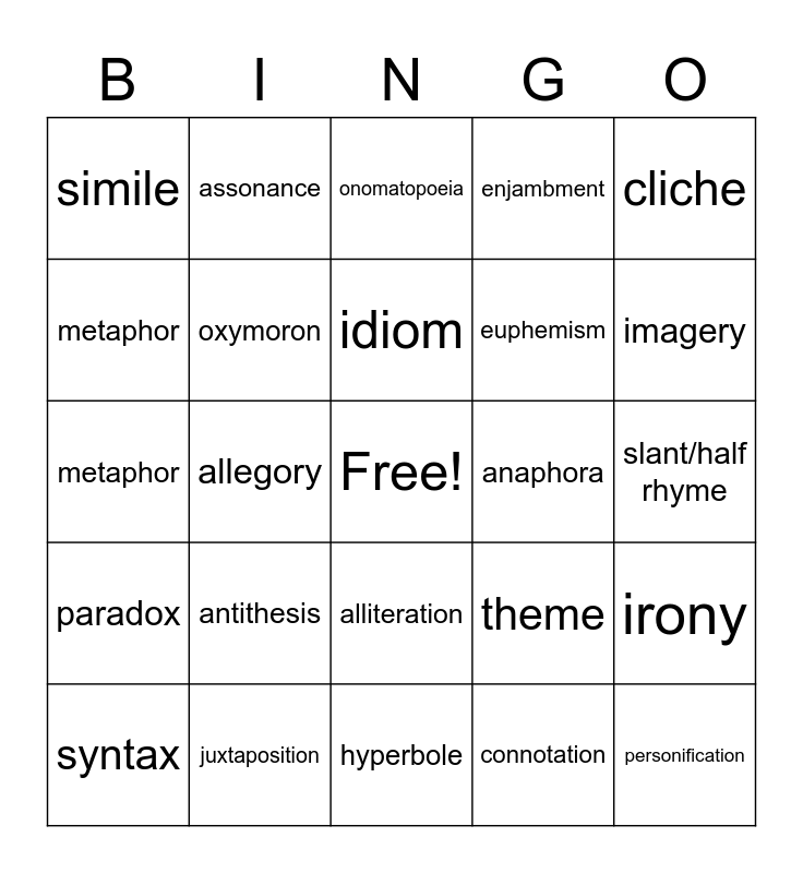 This bingo card has a free space and 24 words: antithesis, juxtaposition, idiom, syntax, cliche, simile, metaphor, assonance, anaphora, alliteration, euphemism, metaphor, theme, irony, oxymoron, connotation, slant/half rhyme, onomatopoeia, imagery, allegory, personification, paradox, enjambment and hyperbole.