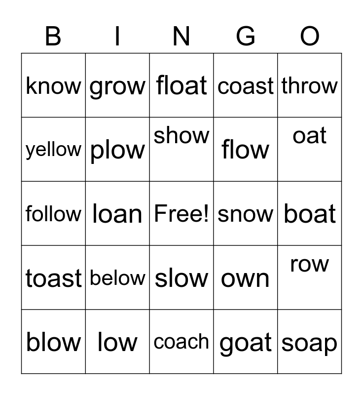 This bingo card has a free space and 24 words: below, low, show, blow, throw, know, yellow, grow, snow, slow, flow, follow, own, row, plow, goat, boat, float, oat, loan, soap, toast, coast and coach.