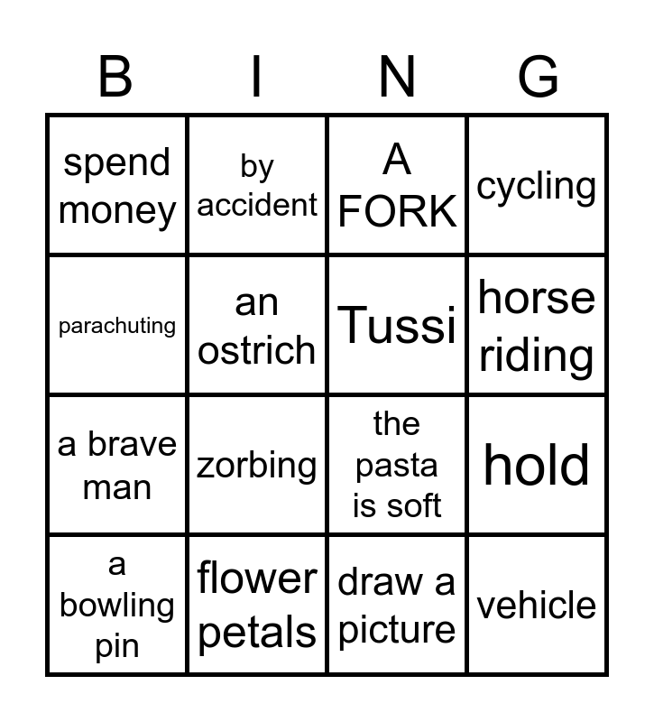 This bingo card has 16 words: flower petals, hold, A FORK, spend money, a brave man, by accident, the pasta is soft, draw a picture, parachuting, an ostrich, a bowling pin, cycling, zorbing, horse riding, Tussi and vehicle.