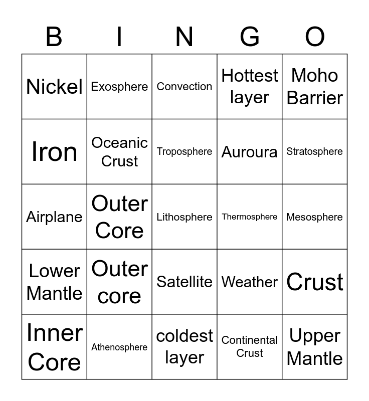 This bingo card has a free space and 24 words: Outer core, Athenosphere, Troposphere, Inner Core, Moho Barrier, Nickel, Iron, Exosphere, Thermosphere, Satellite, Auroura, Airplane, Weather, Crust, Oceanic Crust, Continental Crust, Mesosphere, Convection, Stratosphere, Outer Core, Upper Mantle, Lower Mantle, Hottest layer and coldest layer.