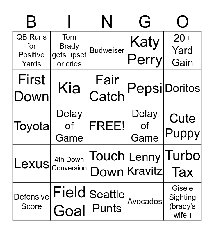 This bingo card has a free space and 24 words: 4th Down Conversion, Field Goal, Fair Catch, Defensive Score, 20+ Yard Gain, QB Runs for Positive Yards, First Down, Tom Brady gets upset or cries, Delay of Game, Touch Down, Pepsi, Toyota, Lenny Kravitz, Turbo Tax, Kia, Avocados, Cute Puppy, Budweiser, Doritos, Delay of Game, Gisele Sighting (brady's wife ), Lexus, Katy Perry and Seattle Punts.