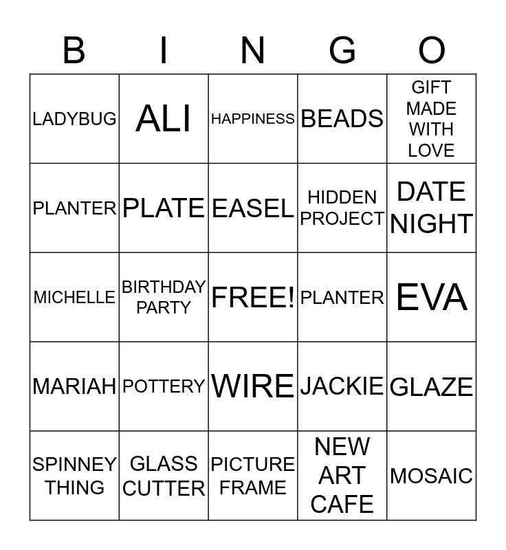 This bingo card has a free space and 24 words: POTTERY, GLASS CUTTER, EASEL, SPINNEY THING, GIFT MADE WITH LOVE, LADYBUG, PLANTER, ALI, PLANTER, WIRE, HIDDEN PROJECT, MICHELLE, JACKIE, GLAZE, PLATE, NEW ART CAFE, EVA, HAPPINESS, DATE NIGHT, BIRTHDAY PARTY, MOSAIC, MARIAH, BEADS and PICTURE FRAME.