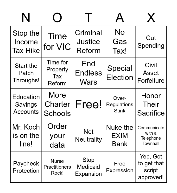 This bingo card has a free space and 24 words: Order your data, Nurse Practitioners Rock!, End Endless Wars, Paycheck Protection, Cut Spending, Stop the Income Tax Hike, Start the Patch Throughs!, Time for VIC, Over- Regulations Stink, Net Neutrality, Special Election, Education Savings Accounts, Nuke the EXIM Bank, Communicate with a Telephone Townhall, Time for Property Tax Reform, Free Expression, Honor Their Sacrifice, Criminal Justice Reform, Civil Asset Forfeiture, More Charter Schools, Yep, Got to get that script approved!, Mr. Koch is on the line!, No Gas Tax! and Stop Medicaid Expansion.