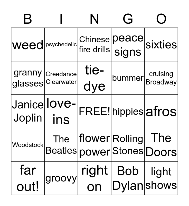 This bingo card has a free space and 24 words: The Beatles, groovy, tie-dye, far out!, sixties, weed, granny glasses, psychedelic, hippies, flower power, bummer, Janice Joplin, Rolling Stones, The Doors, Creedance Clearwater, Bob Dylan, afros, Chinese fire drills, cruising Broadway, love-ins, light shows, Woodstock, peace signs and right on.