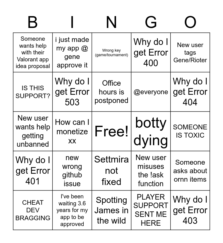 This bingo card has a free space and 26 words: Settmira not fixed, PLAYER SUPPORT SENT ME HERE, Office hours is postponed, I've been waiting 3.6 years for my app to be approved, New user tags Gene/Rioter, Someone wants help with their Valorant app idea proposal, IS THIS SUPPORT?, i just made my app @ gene approve it, SOMEONE IS TOXIC, New user misuses the !ask function, @everyone, New user wants help getting unbanned, Someone asks about ornn items, CHEAT DEV BRAGGING, How can I monetize xx, Someone dms everybody on the server (includes bots), Why do I get Error 400, Why do I get Error 401, Wrong key (game/tournament), Why do I get Error 403, Why do I get Error 404, Spotting James in the wild, botty dying, new wrong github issue, Why do I get Error 503 and Someone randomly joins the voice call and immediatly leaves.