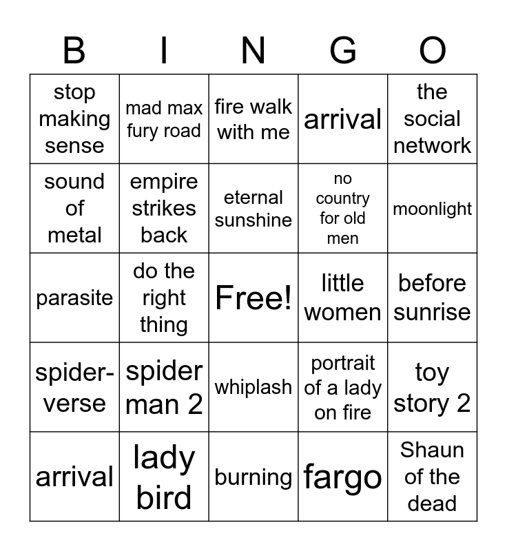 This bingo card has a free space and 24 words: spider man 2, lady bird, eternal sunshine, arrival, the social network, stop making sense, sound of metal, mad max fury road, little women, whiplash, no country for old men, parasite, portrait of a lady on fire, toy story 2, empire strikes back, fargo, before sunrise, fire walk with me, moonlight, do the right thing, Shaun of the dead, spider-verse, arrival and burning.