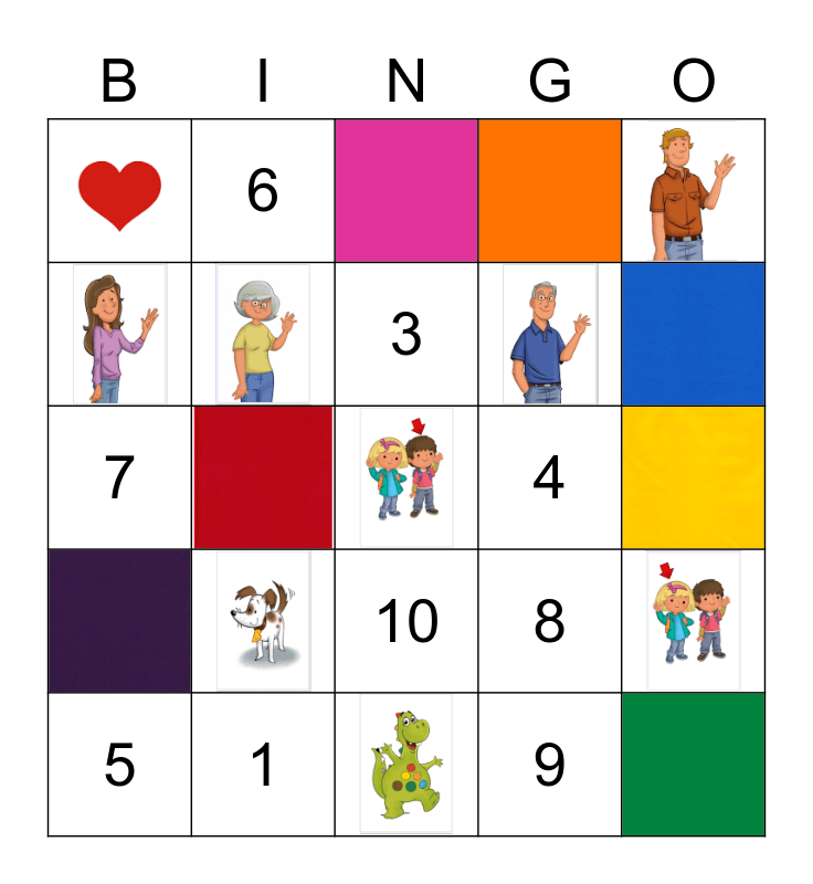 This bingo card has 15 images, a free space and 9 words: 1, 3, 5, 6, 4, 10, 7, 8 and 9.