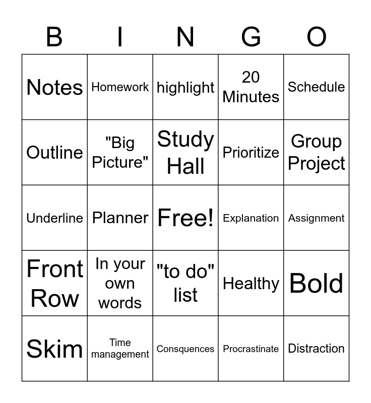 This bingo card has a free space and 24 words: In your own words, Time management, Study Hall, Skim, Schedule, Notes, Outline, Homework, Explanation, "to do" list, Prioritize, Underline, Healthy, Bold, "Big Picture", Procrastinate, Assignment, highlight, Group Project, Planner, Distraction, Front Row, 20 Minutes and Consquences.