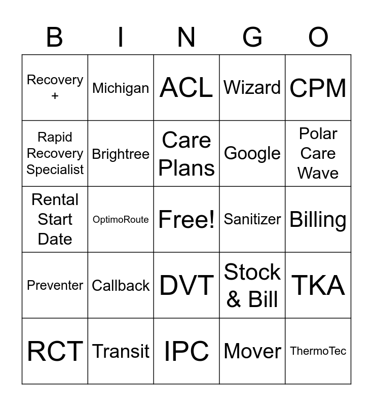 This bingo card has a free space and 61 words: Lytle, Transit, Reliever, Preventer, Mover, Planner Plus, Brightree, RingCentral, Google, Workflow v2.5, Wizard, Insurance, Rapid Recovery Specialist, Rapid Recovery Trainer, Virtual Setup, Recovery +, ThermoTec, CPM, Immobilizer, Care Plans, Sanitizer, ACL, RCT, TKA, TSA, THA, MUA, Plasmaflow, Polar Care Wave, Sales, CMN, Extension, Verbal Order, Dearbon Ortho, Michigan, Texas, ACHC, OptimoRoute, Patient, Rental Start Date, Rental Stop Date, Callback, Billing, Planner, Stock & Bill, Pickup, Cleaning & Validating, Fulfillment, PTO, DVT, IPC, Paychex, DocuSign, On-Call, Telemed, Huddle, Equipment Malfunction, Troubleshooting, Doctor, Order ID and Brightree ID.