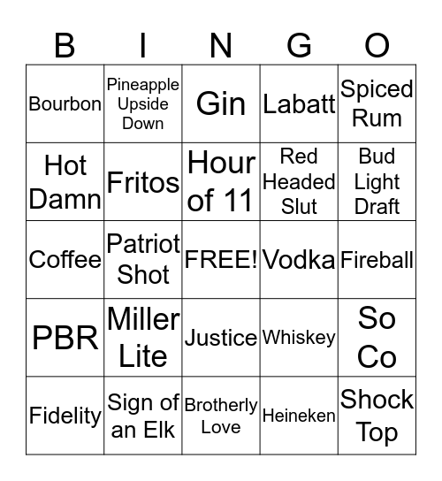 This bingo card has a free space and 36 words: Bud, Charity, Cheetos, Fritos, Whiskey, PBR, Hour of 11, Labatt Light, Spiced Rum, Bud light, Patriot Shot, Labatt, Mikes Lemonade, Vodka, Bud Light Draft, Bourbon, Tequila, Miller Lite, Shock Top, Gin, Fireball, So Co, Sign of an Elk, Fidelity, Brotherly Love, Pineapple Upside Down, Coffee, Sour Apple Pucker, Red Headed Slut, Hot Damn, Rum, Jager Bomb, Heineken, Justice, Plain Chips and Blakes Cider.
